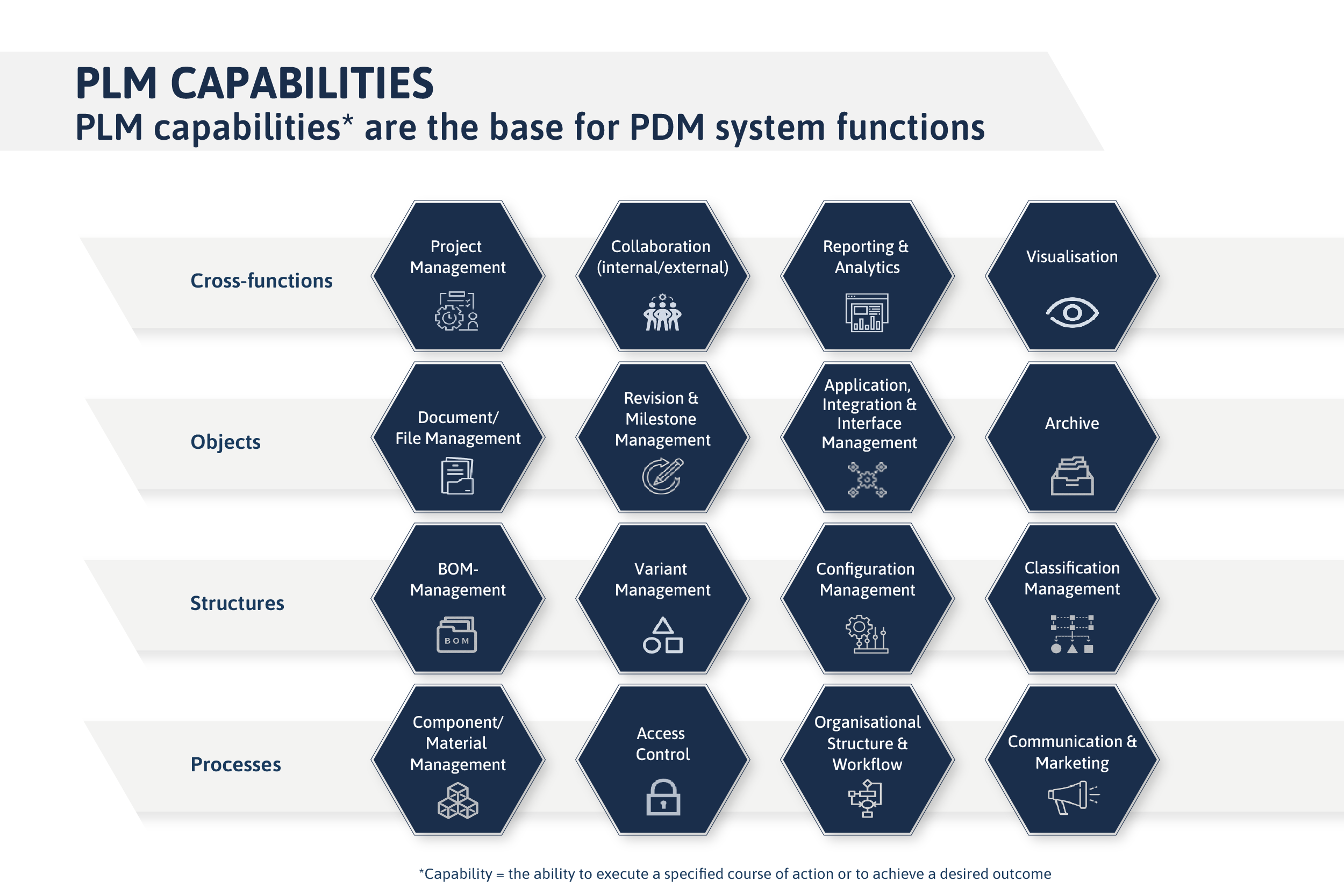 Successful PLM is not a matter of chance — it results from the interplay of (1) a clear strategy, (2) well-designed integration, and (3) a structured implementation.